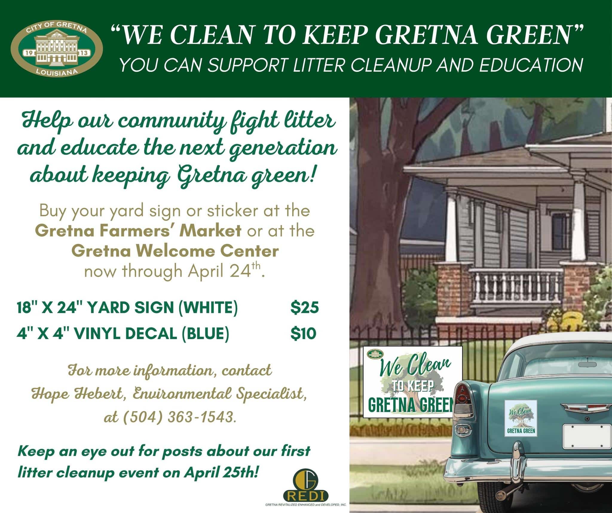 Latest News Gretna Clean Up Day Signs and Vinyl Decals For Sale CLICK HERE TO VOLUNTEER More Gretna News City Of Gretna: Notice of Special Election Posted: Thursday, March 26, 2026 March 2026 Gretna Senior and Wellness Calendar Posted: Sunday, March 1, 2026 Recycling is Coming to Gretna! Posted: Thursday, February 26, 2026