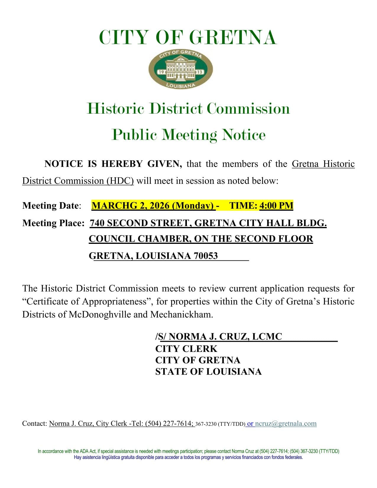 Latest News Historic District Commission Public Meeting Notice- March 2, 2026 @4:00pm More Gretna News Press Alert: Gretna Food Truck Festival- April 18 5pm- 9pm Posted: Thursday, April 9, 2026 City Of Gretna: Notice of Special Election Posted: Thursday, March 26, 2026 PRESS RELEASE: Shop the Huey Easter Market- March 21, 2026 9AM- @PM Posted: Sunday, March 15, 2026