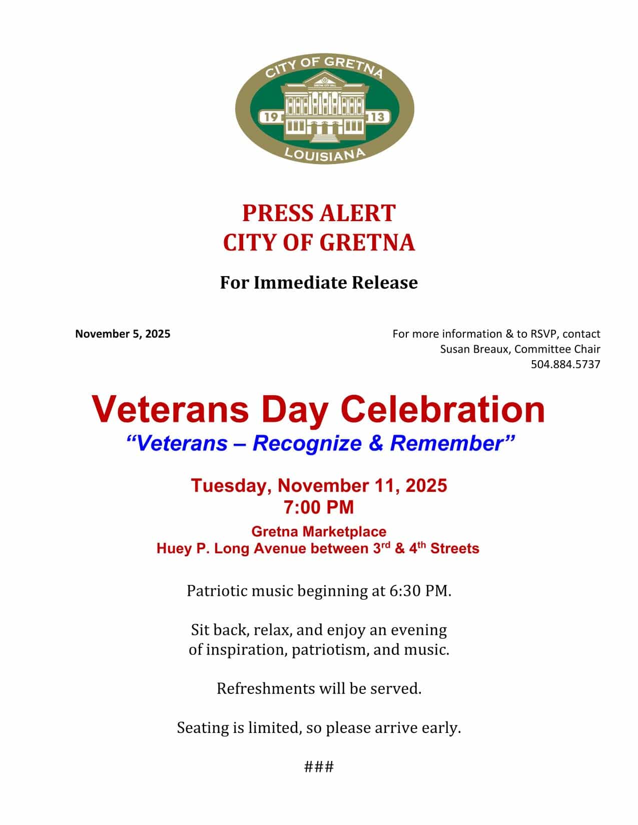 PRESS RELEASE: City of Gretna Offices Closed in Observance of Veterans Day Posted: Sunday, November 9, 2025