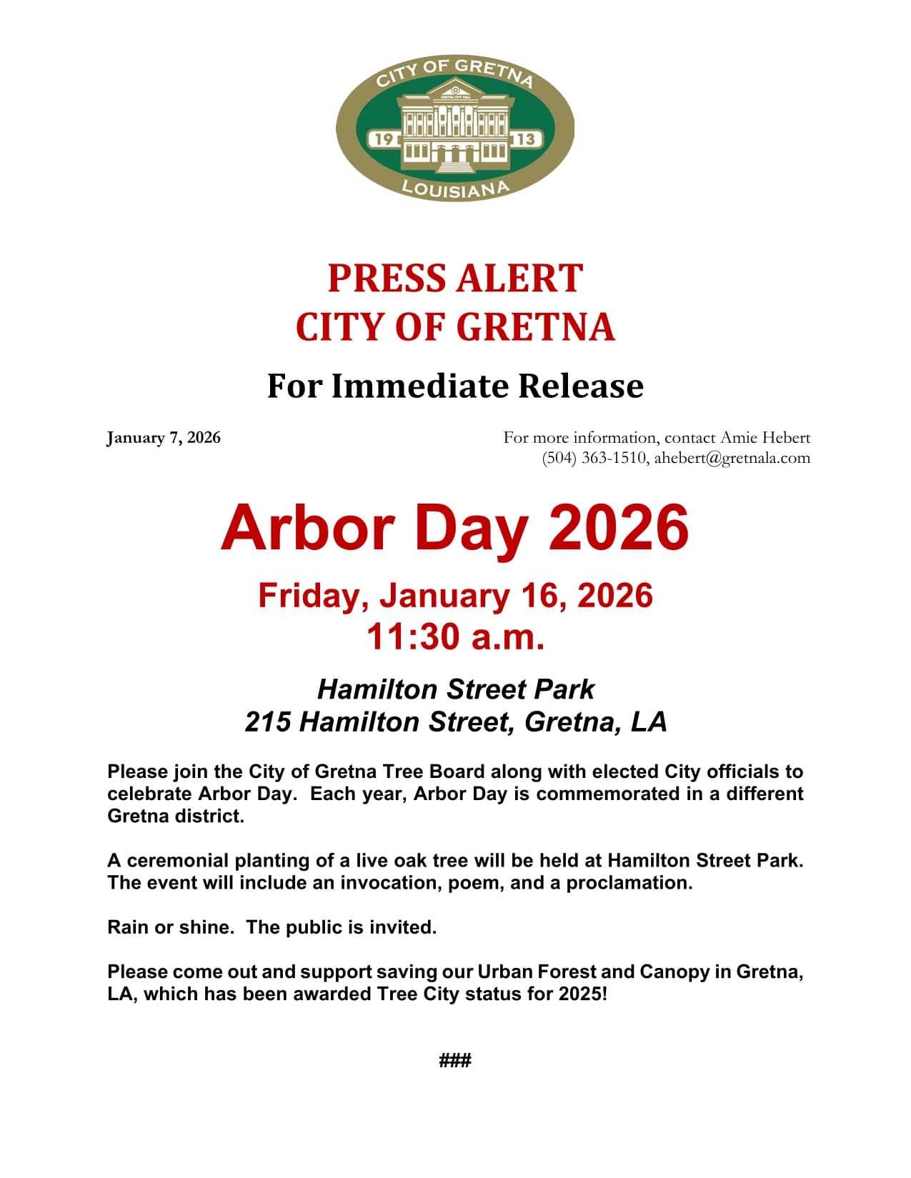 Latest News Press Release: Arbor Day 2026 January 16, 2026 @11:30 More Gretna News PRESS ALERT: 2026 Mardi Gras Kick-off in Gretna Posted: Thursday, January 8, 2026 4th Street Railroad Repairs Posted: Monday, January 5, 2026 5th Street Closure and Detours- Starting 6 AM Jan.19, 2026 and Ending 6 PM Apr 10, 2026 Posted: Monday, January 5, 2026