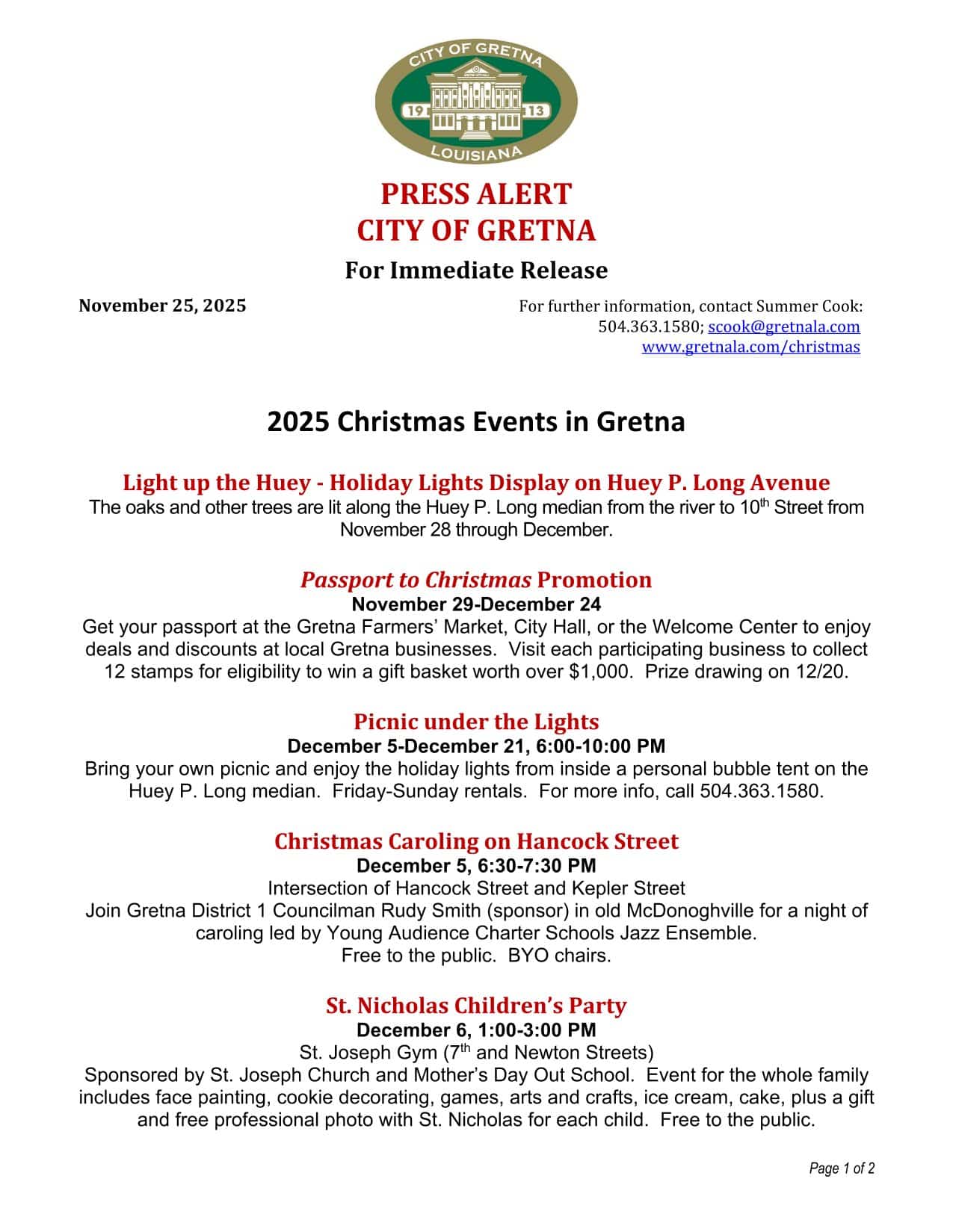 Press Alert: Gretna Christmas Parade and Tree Lighting December 7, 2025 @5:00PM Posted: Tuesday, December 2, 2025